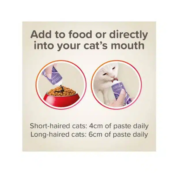 روش استفاده: خمیر را میتوانید مستقیماً از تیوب به گربه خود بدهید (به دلیل طعم مطلوب)، روی غذا بریزید یا بر روی پنجه او بمالید تا لیس بزند.