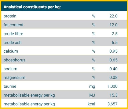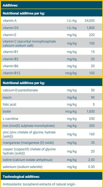 مواد تشکیل دهنده اصلی: سیب زمینی خشک، آرد نخود، پروتئین سیب زمینی، حشرات (پروتئین هیدرولیز شده)، چربی طیور، تفاله چغندر خشک، مخمر هیدرولیز شده و مواد معدنی.