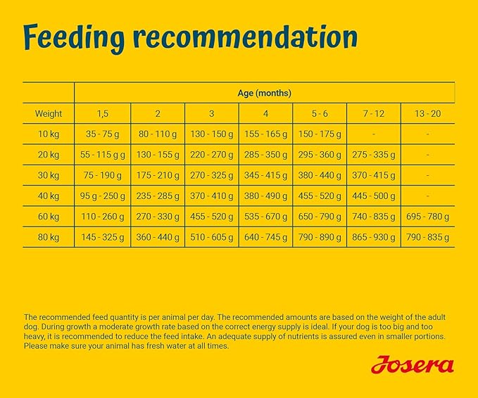 غذای خشک جوسرا سنسی جونیور از سن ۸ هفتگی تا رسیدن به بلوغ توصیه میشود. برای تولههای نژاد بزرگ، این مدت میتواند تا ۲۴ ماهگی ادامه یابد.