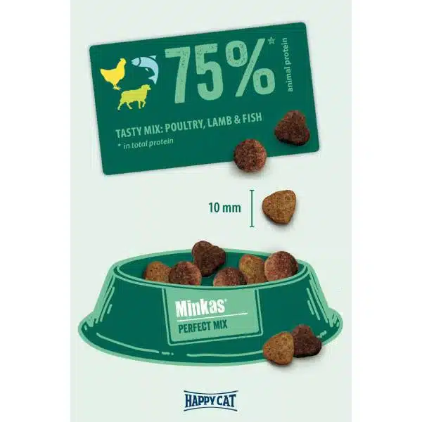 غذای هپی کت مینکاس پرفکت میکس یک انتخاب عالی برای تمامی نژادهای گربه بالغ (از ۱ تا ۷ سال) با سطح فعالیت معمولی است که به دنبال یک رژیم غذایی با طعم لذیذ و ارزش تغذیهای کامل هستند.